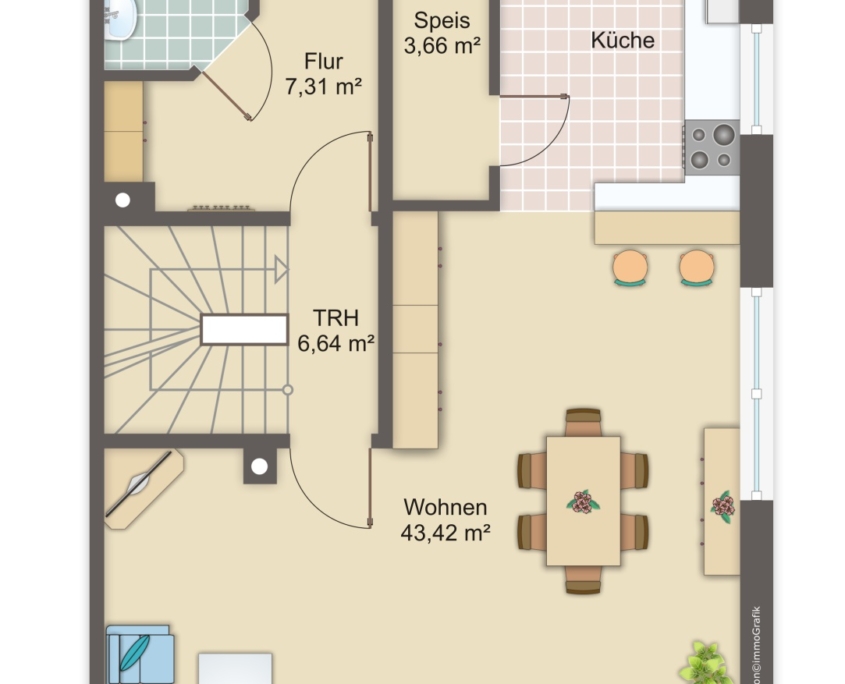 – Wohn-Esszimmer mit Ausgang zum Südostgarten (komfortable Hebe-/Schiebetür), Kaminanschluss, LED-Leuchten in der Decke