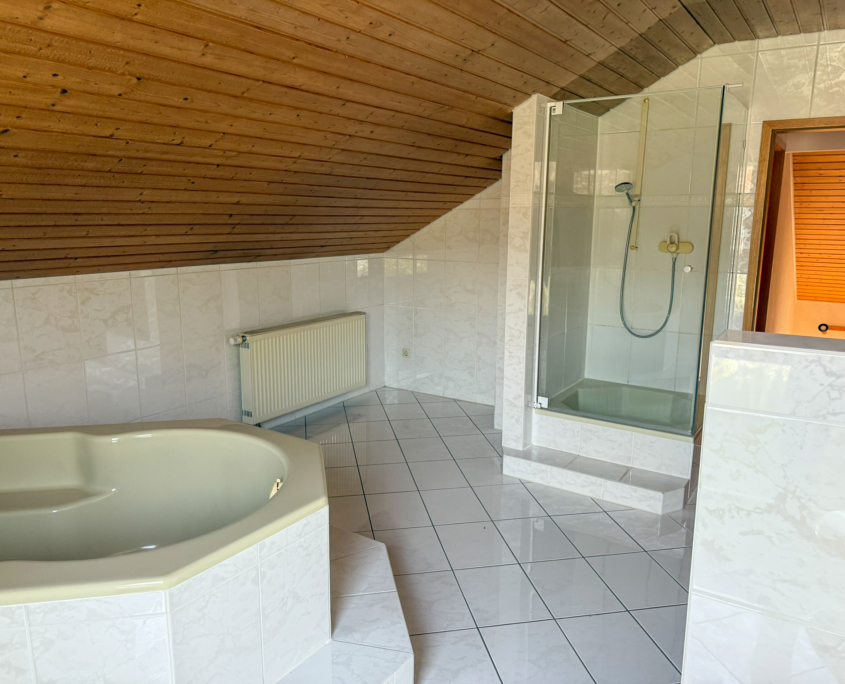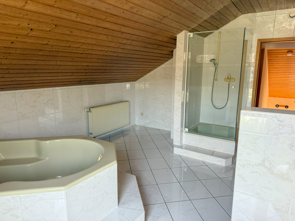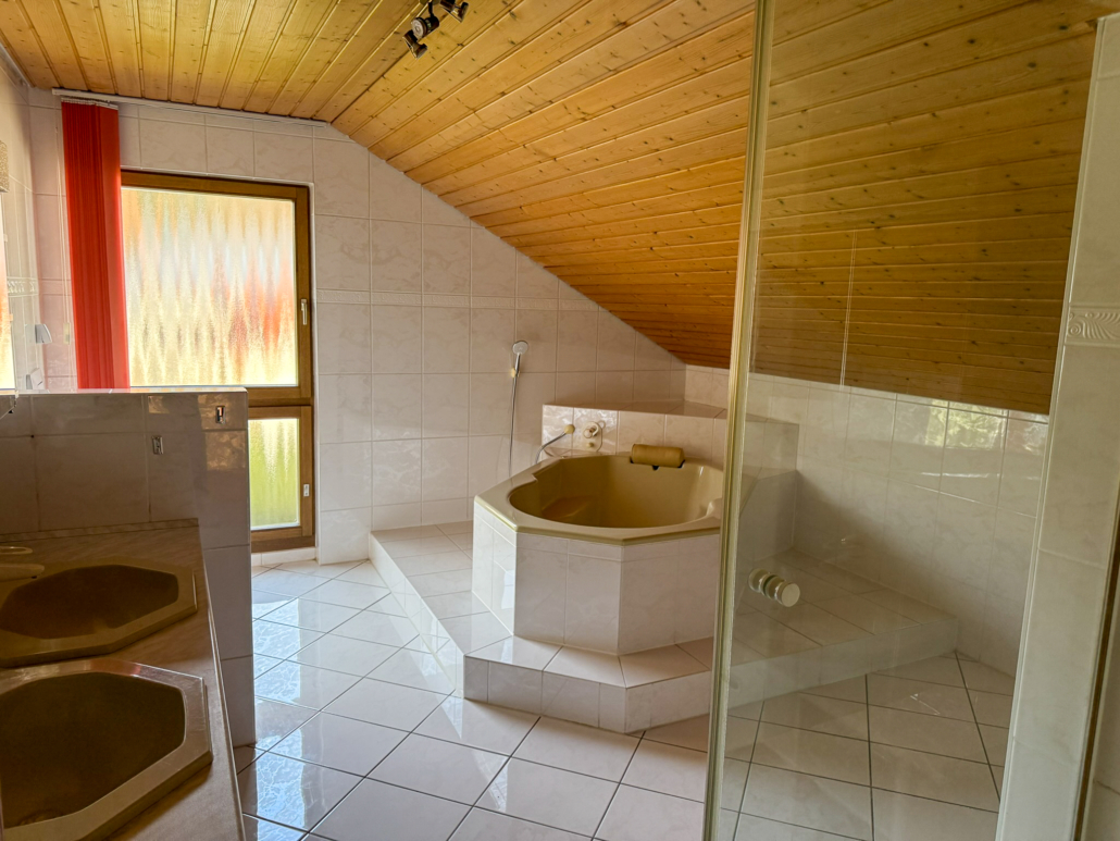 großes Bad mit Wanne, Dusche, Doppelwaschbecken, WC und Bidet (Fenster)