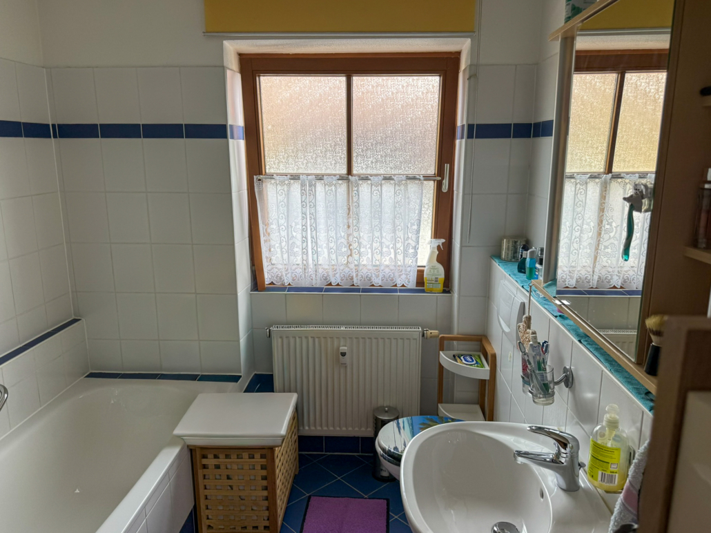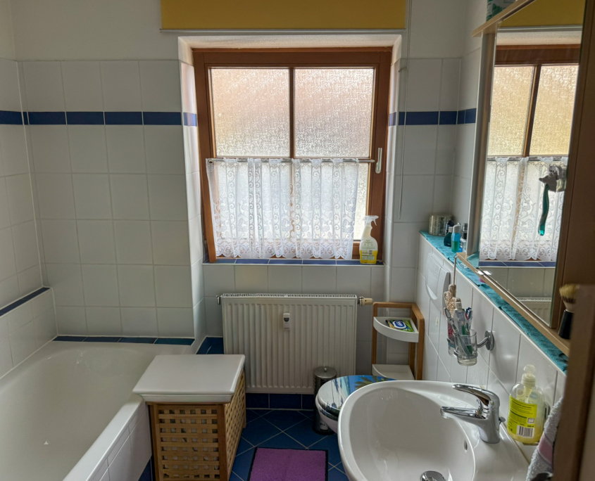 Bad mit Wanne und Dusche, Waschbecken, WC und Fenster