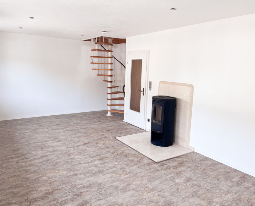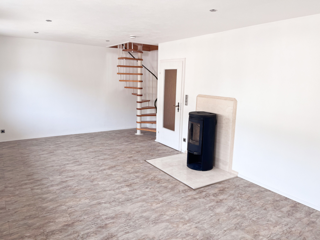 – Wohnzimmer mit Schwedenofen und Wendeltreppe zum Dachgeschoss (Fliesenboden)