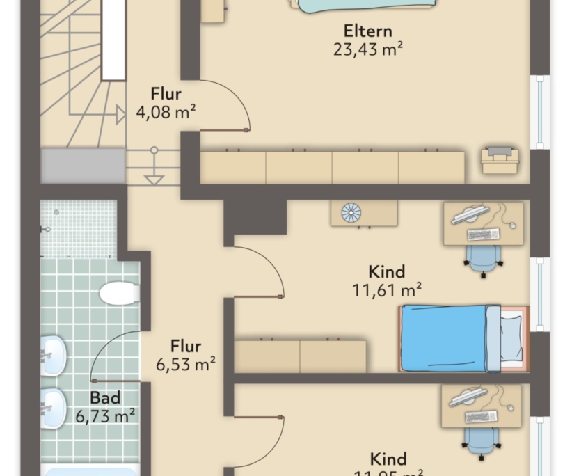 – Zwei Kinderzimmer/Büros mit Parkettboden