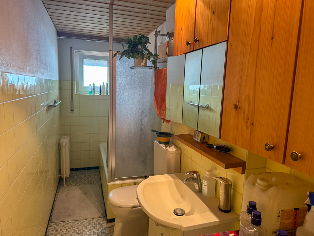 Bad mit Wanne, WC, Waschbecken, Waschmaschinenanschluss und Fenster